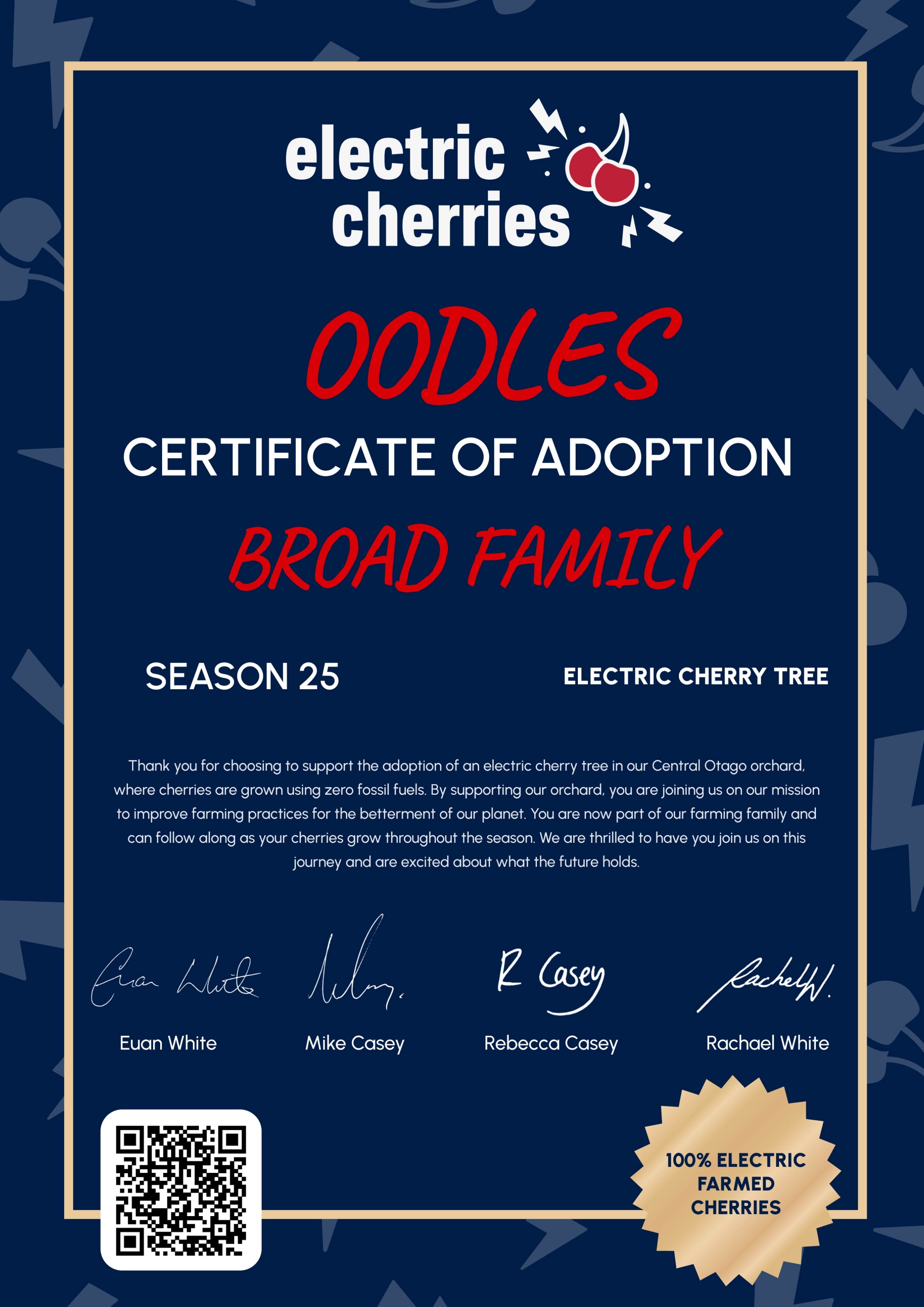 A couple of weeks back, we featured on A New Zealand Food Story with Ben Bayly, sharing the journey of how we’re growing export-grade cherries for Kiwi families using 100% electric machinery. It was such an awesome opportunity to show the rest of NZ what we’re up to and give people a peek at the very trees you’ve adopted. We loved having Ben and the crew out here, and seeing the orchard (and your tree!) on national TV was a real pinch‑me moment for the whole team.