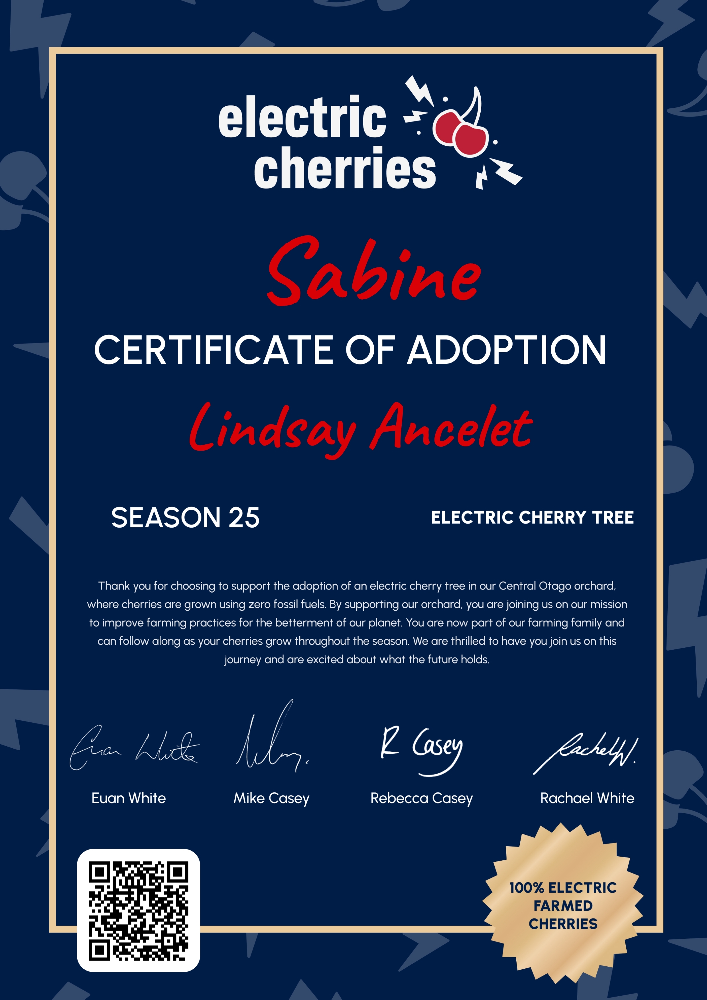 A couple of weeks back, we featured on A New Zealand Food Story with Ben Bayly, sharing the journey of how we’re growing export-grade cherries for Kiwi families using 100% electric machinery. It was such an awesome opportunity to show the rest of NZ what we’re up to and give people a peek at the very trees you’ve adopted. We loved having Ben and the crew out here, and seeing the orchard (and your tree!) on national TV was a real pinch‑me moment for the whole team.
